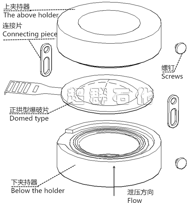 爆破片為單層預(yù)拱金屬膜片,凹面接觸介質(zhì),超壓時拱面壁厚被拉伸減薄而破壞,從而泄放壓力。爆破壓力由爆破片本身材料的抗拉強度決定。