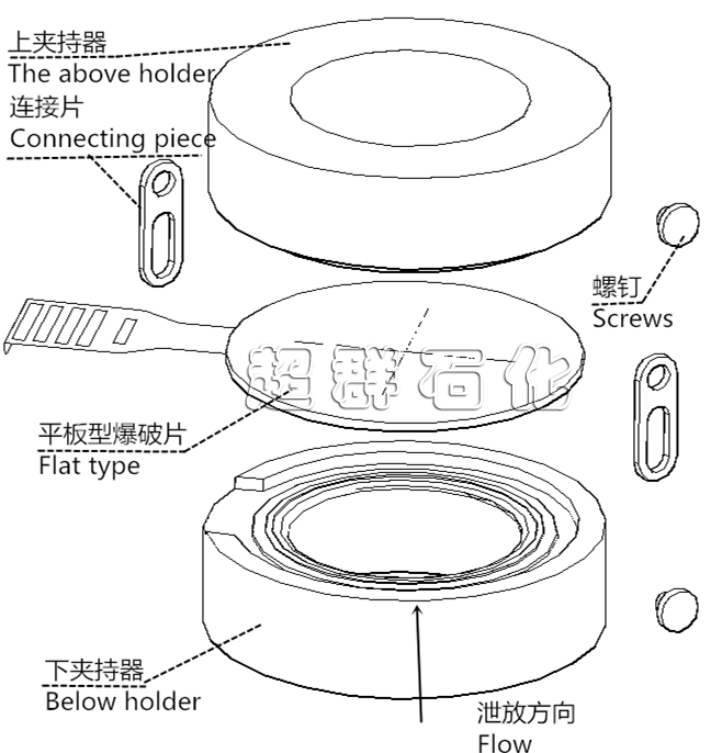 爆破片壓力敏感元件呈平板形。爆破片由周邊透縫(或中心處)及相鄰終止孔間構(gòu)成的減弱結(jié)構(gòu)控制,爆破沿透縫撕裂形成泄放通道。