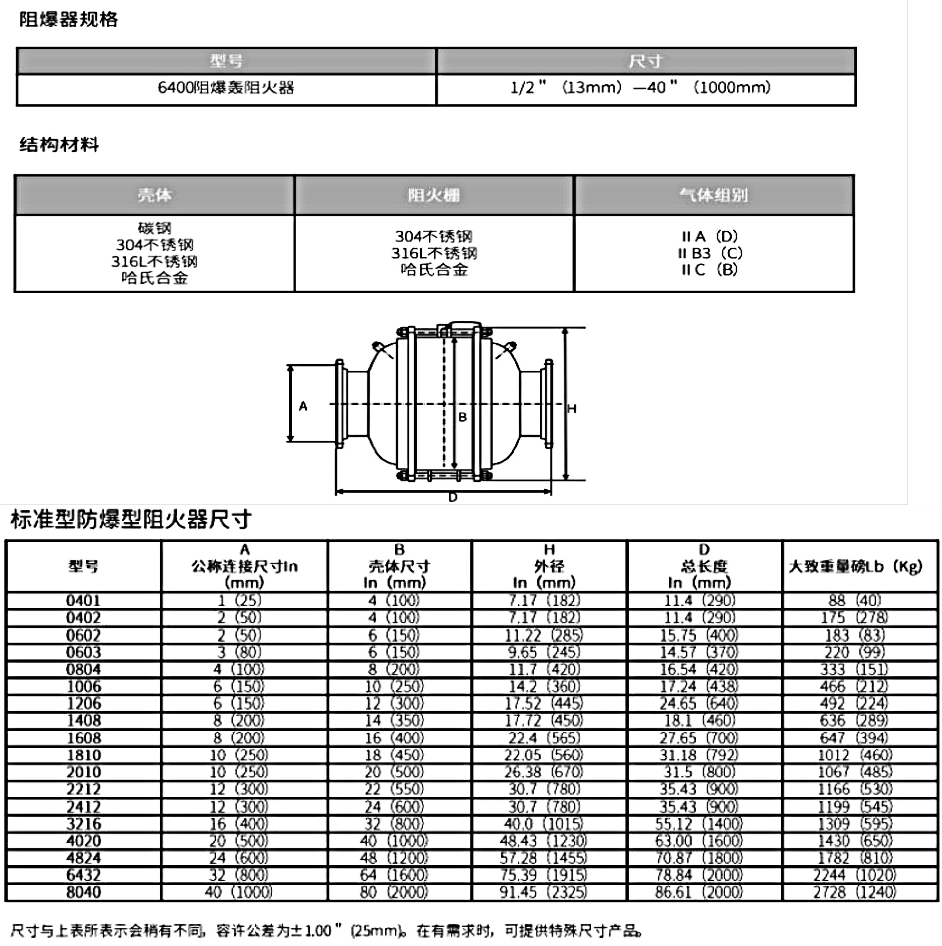 該型阻火器主要用于長管段或有多個彎頭的管段,用以阻止穩定和不穩定爆轟。另外,該系列阻火器還可阻止局限和非局跟、低壓和高壓爆燃。所有的組件都 是雙向的,并經認證可阻止來自任一方向的、以亞音速或超音速傳播的、已點燃的可燃蒸汽混合氣。該系列阻火器,采用法蘭連接,無需拆除管連接,便可拆 卸阻火柵組件,易于清理和更換。標準殼體材料為碳鋼和不銹鋼。現有 304 和 316L 不銹鋼阻火柵組件。如有需要,可提供特殊材料和防護涂層。