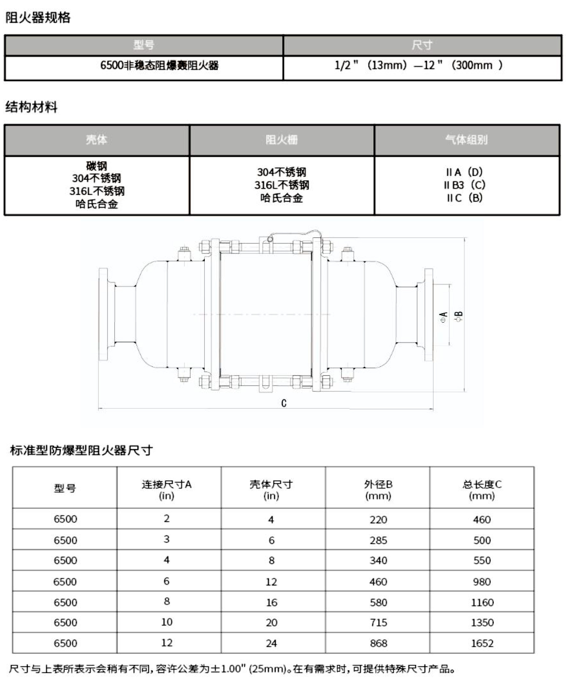 非穩(wěn)態(tài)阻爆轟阻火器主要用于無限制非穩(wěn)態(tài)爆轟。此系列阻火器是雙向構(gòu)造,并經(jīng)試驗驗證,可阻止來自任一方向的、以亞音速或超音速傳播的已點(diǎn)燃的可燃 蒸汽混合氣。